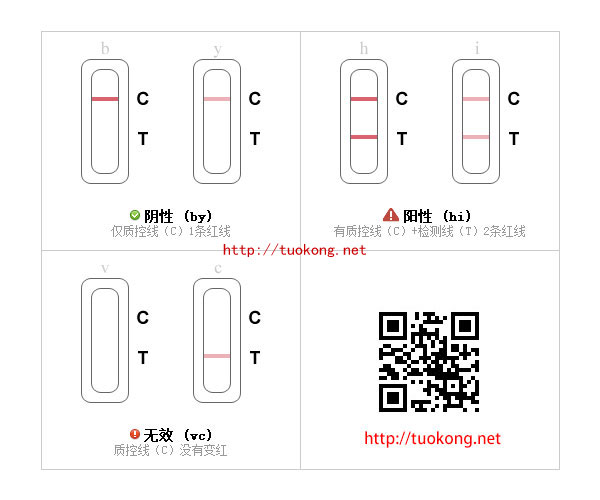 (1) 阴性(-)结果:仅质控线(C)变红,说明是这一个安全的结果。 (2) 阳性(+)结果:有质控线(C)+ 检测线(T)2条红线,这是一个危险的结果,说明有可能感染HIV。 (3) 无效的结果:质控线(C)没有变红,说明检测无效,为避免检测失败,加血量需要1大滴。 注意:艾博试纸为初筛产品,如果出现阳性(+)结果,应重复检测或前往疾控中心(CDC)做确证检测,确证检测才是最终结果。